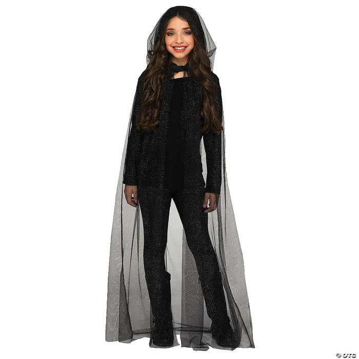 Transform your child into a dazzling star of any costume party or themed event with our Kids' Hooded Sparkle Cape Costume from www.Costume-shop.com. This lovely hooded cape is the perfect add-on to a variety of costumes, enhancing both simplicity and glamour. Crafted from sheer black glitter fabric, the cape sparkles brilliantly in the dark, ensuring your little one shines brightly wherever they go. The full-length front-closure design allows the cape to flow gracefully with every step, adding an elegant and enchanting touch to their ensemble.