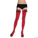 Red knee highs with black dots and lady bug bows. ONE SIZE FITS MOST ADULTS.