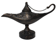 Beautiful bronze-colored ancient looking Genie Lamp actually has eerie mist emanating from the spout. Speaks multiple spooky phrases! Sound and motion activated. Requires 3 AAA batteries, not included. Made of plastic,80%; electronics,18%; metal,2%. Measures approximately 13 x 4 x 9 inches. Lamp speaks, "Ask and you shall receive.", "Come back tomorrow, I'm busy." "Think carefully before you wish, every wish has a consequence."
