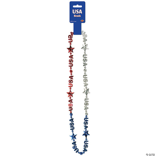 USA Beads. They will be a great accessory to wear at the next patriotic party! Strand of beads features solid color segments of "USA" beads, star b...
