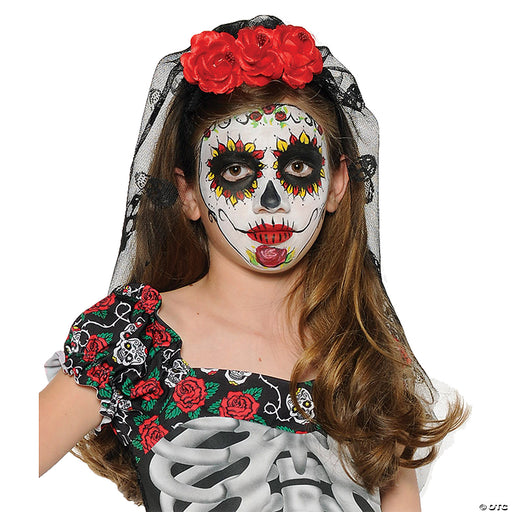 Day Of The Dead Mantia. Perfect Accessory for any Day of The Dead Celebrations! Includes : Headband with attached veil and red flowers with skull a...