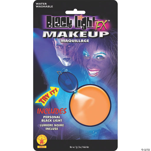 Color blister pack containing .3oz makeup cup and black light pendant allows your patrons to see how the makeup glows. Orange.