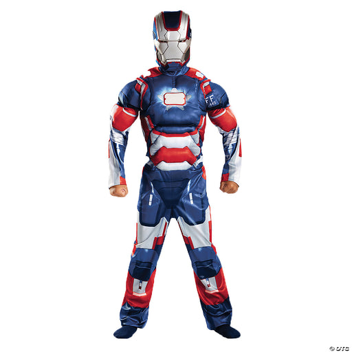 Patriot version of Iron Man includes red, white and blue padded jumpsuit with muscle torso and arms, and character mask. Child Large, fits boys siz...