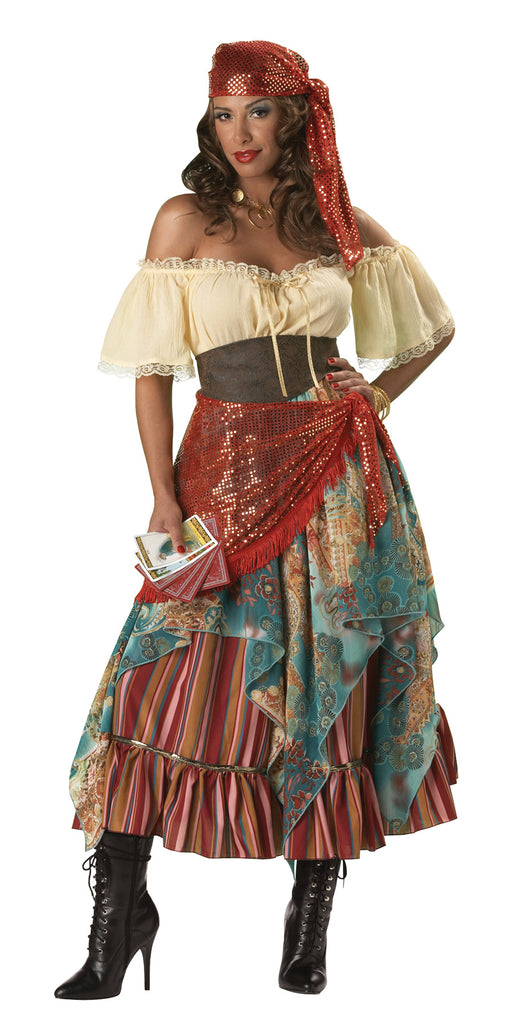 3pc Fortune Teller Gypsy Costume Includes Sequin Headband, Top with Gold Coin Trim, and Scrunched Sequin Skirt