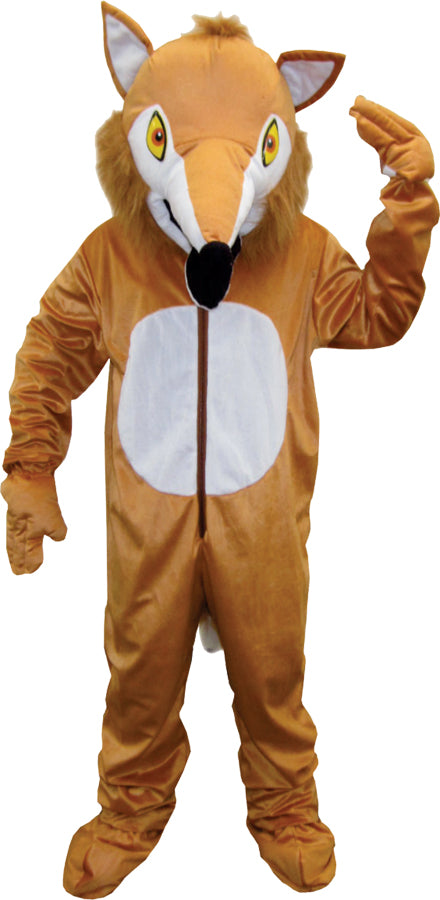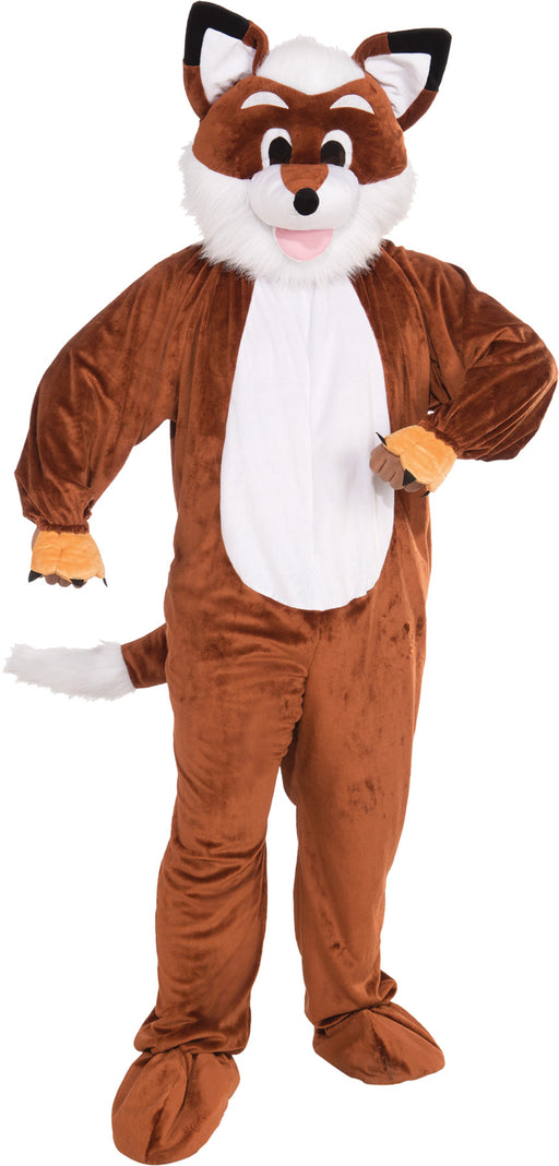 Plush fox mascot includes head with see-through eye mesh, jumpsuit and foot covers. One size fits most up to size 42.
