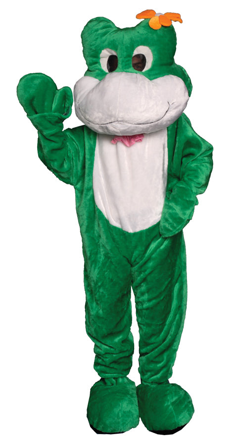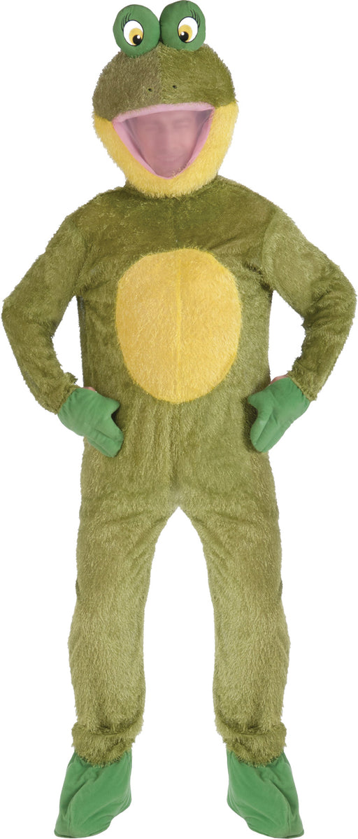 Plush frog mascot includes head with see-through eye mesh, jumpsuit and foot covers. One size fits most.