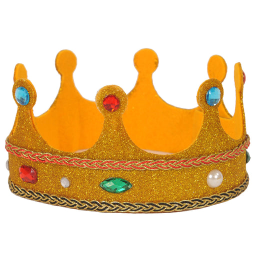 Product Includes: Crown Item# 611-L Gold king’s crown has faux jewels in assorted colors and shapes. Includes: Crown. An adjustable Velcro closu...