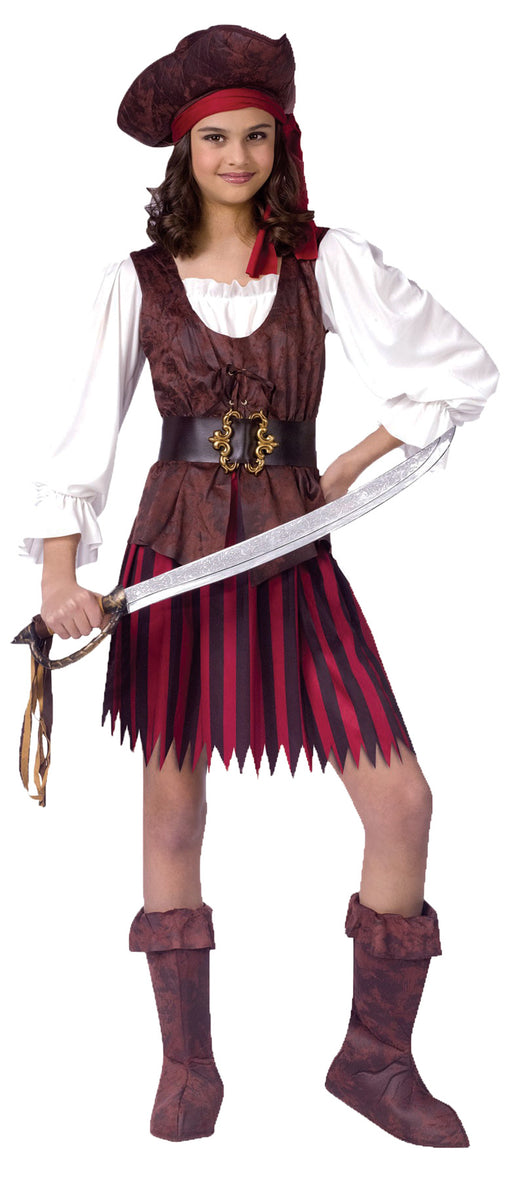 One piece dress with attached vest, belt, bandana, and hat. Polyester. Boot tops included. Sword is not included.