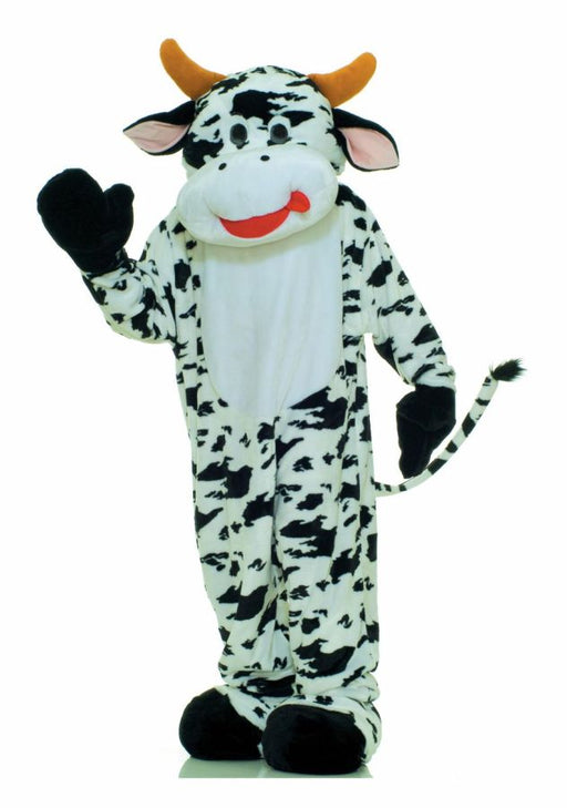 Comical deluxe plush moo cow mascot costume. Cow head, with see thru eye mesh, jumpsuit with attached mittens and foot covers. One size fits most a...