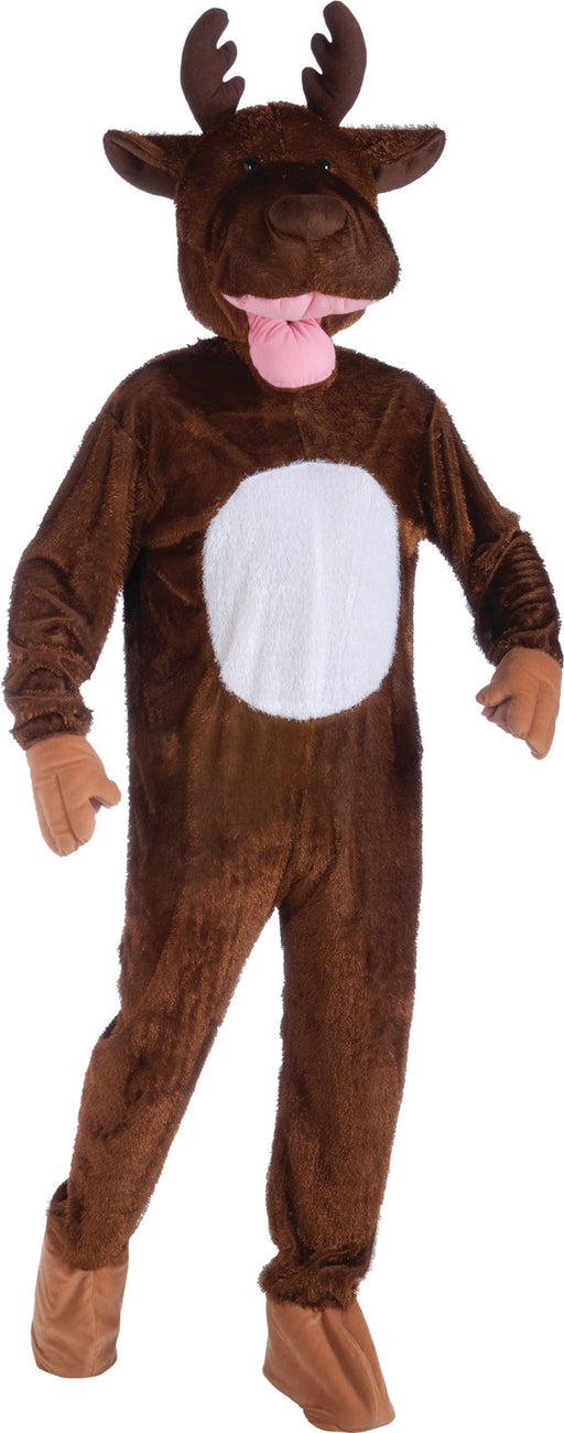 Plush moose mascot includes headpiece with face opening and jumpsuit with attached mitts and shoe covers. One size fits most.