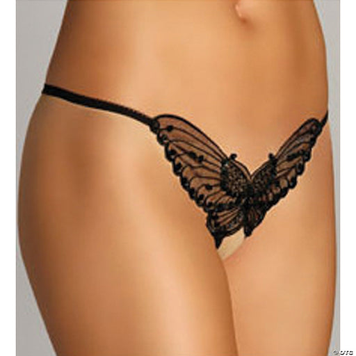 Sheer butterfly appliqued crotchless panty with pearl and sequined details. One Size.