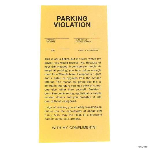 ! Insulting parking citations that look like the real thing. Place on a deserving windshield, and enjoy the fun!.