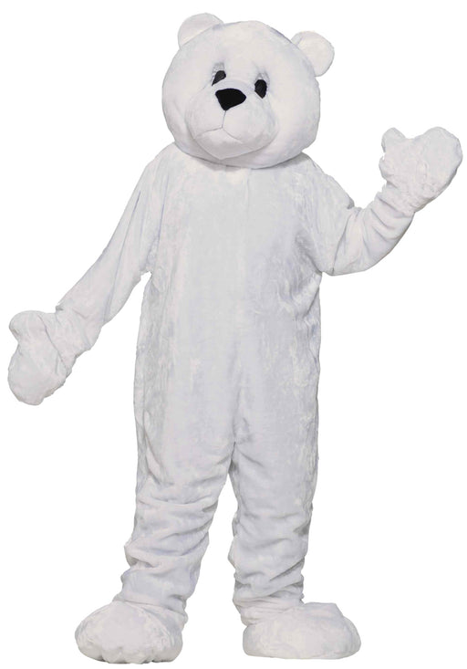 Plush polar bear mascot includes head with see-through eye mesh, jumpsuit with attached mittens with hidden openings and foot covers. One size fits...