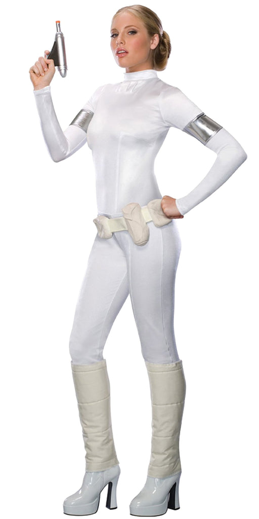 You are ready for action with this sleek Amidala costume! White long-sleeved jumpsuit with attached boot tops includes belt and blaster!