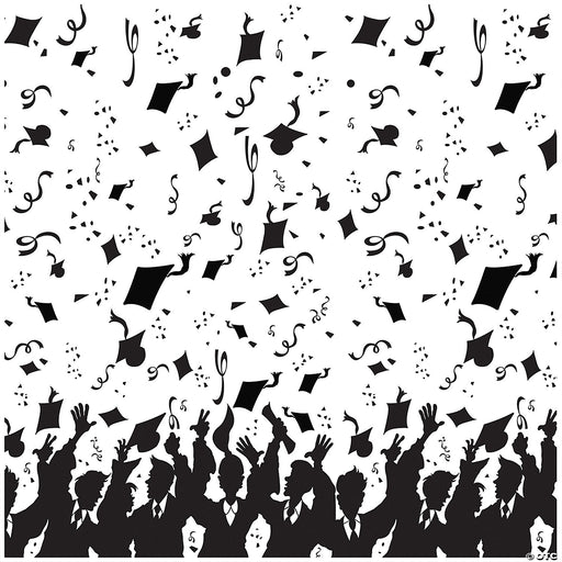 Hang this backdrop on a wall for a great decoration! This plastic backdrop features a white background with black silhouettes of graduates with cap...