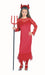 Child Devil Costume Includes Long Sleeve Red Gown with Lace Sleeves and Layered Zig Zag Cut Bottom and Sequin Horns Headband. Pitchfork and Stockings Not Included.