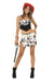 Sexy Costume Includes Black and White Cow Print Mini Skirt, Matching Black Top with Cow Print Fringe, Cowboy Hat and Gun Holster. Stockings Not Included.