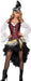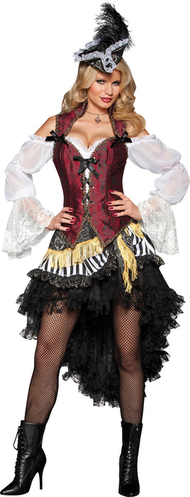 You will certainly catch everyone's eye in this quality costume! Lace-up look brocade vest over a peasant dress with multi-layered ruffle skirt and petticoat comes with brocade hip sash and mini tricorn lace-trimmed brocade hat with ostrich plume. Jewelry and fishnet stockings not included.