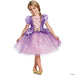 Bring the fairytale to life! Your little princess will look adorable in this toddler Rapunzel gown. Bring your little one’s magical fairytales to life with this Rapunzel dress. She will have a ball dressing up as her favorite princess. The Disney Rapunzel Toddler Classic Costume features a purple and pink dress with puffed sleeves, gold trim, sparkly purple tulle skirt, and a character cameo.
