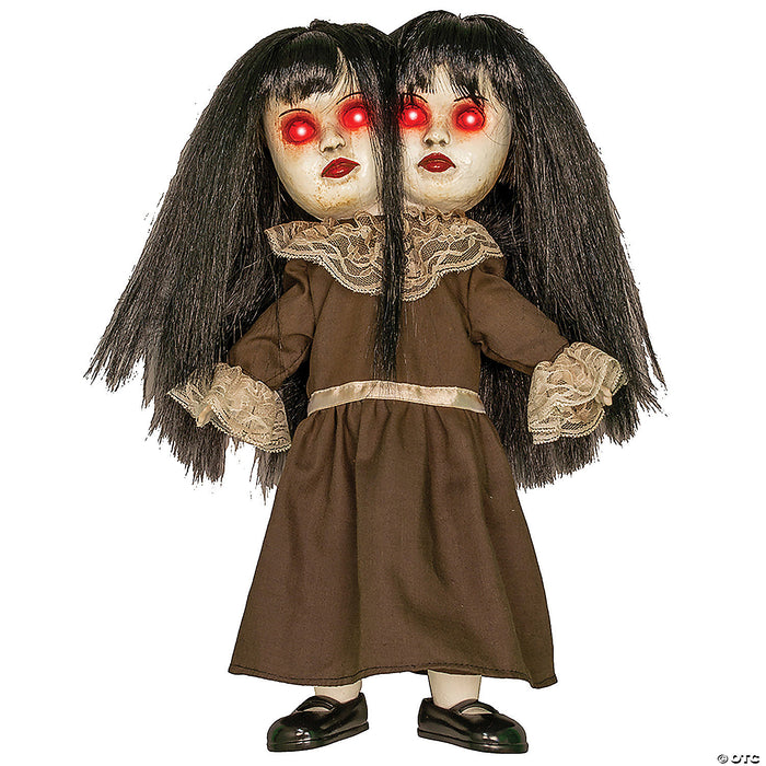 Two Heads Are Deader Than One...Cindy and Sally giggle while debating your demise! Their glowing red LED eyes shine while spooky sounds play and they speak scary phrases. 14 inches tall. Requires 3 AAA Batteries, not included.