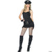 Black zipper front halter dress with belt detail and ruffle skirt fingerless gloves and hat. Black.