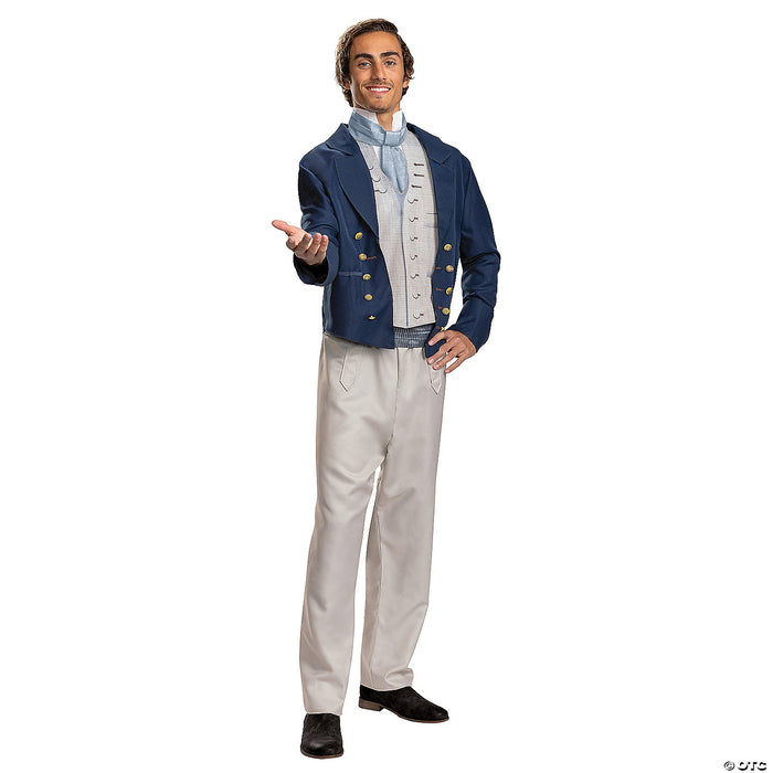 Capture the charm of Ariel’s beloved prince with the Royal Prince Eric Deluxe Costume from www.Costume-shop.com. This elegant ensemble is inspired by Disney's live-action movie "The Little Mermaid" and features a detailed navy jacket with golden button accents that command attention. The costume also includes a blue cravat and a striped cummerbund that enhance the regal appearance. The jumpsuit under the jacket ensures comfort and a coordinated look. Crafted from 100% polyester, this outfit is designed for ease of care and is available in Adult Large/Extra Large sizes 42-46.