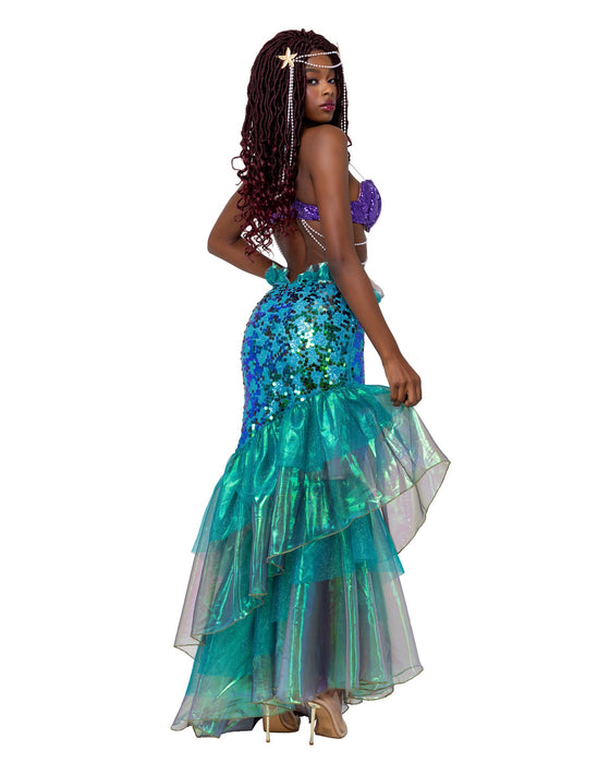 Each piece of this costume is crafted from high-quality materials to ensure a comfortable and flattering fit. The sequin shell bra is designed to provide support and security, while the flare skirt enhances your figure and allows for graceful movement. The entire ensemble is easy to wear and designed to keep you looking and feeling magical throughout your event.