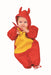 The costume features a red long sleeve drawstring bunting with a yellow front and a drawstring hood with devil horns. Designed to fit newborns sized 0-6 months, this costume ensures comfort and warmth, allowing your little devil to enjoy hours of festive fun.
