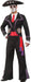 A fantastic costume that will liven up any Day of the Dead Celebration! White shirt front with attached red tie and black vest is topped by a black jacket with purple and white trim with attached ruffled cuffs. Includes matching pants and a red belt sash. Boots and sombrero not included. Adult standard size fits men up to size 42.