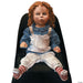 This life-like toddler has delicate red corkscrew curls, blue eyes and a dark secret. She wears a soiled blue flower-print blouse, pantaloons and red and white striped socks. She's a perfect addition to your little girl or zombie Halloween costume. Her metal armchair is included. Constructed of foam and latex.