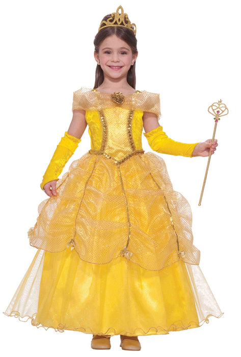 Your own beautiful little princess will love this dressperfectly made for her!! Yellow ankle-length dress with goldaccents, sheer overlay and matching glovettes. Polyester.Staff and tiara not included. Fits childrens small sizes4-6.