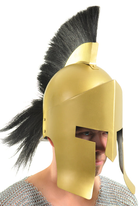 Leonidas is notable for his leadership at the Battle of Thermopylae and led his band of 300 Spartans along with the combined Greek forces determined to resist the Persian Invasion in 481 BC. Authentic style Spartan helmet is made from 18 gauge solid steel in a brass antique style with an inner depth front to back of 9 inches. It is 8 inches wide, 18 inches tall, circumference of 26.6 inches. 2.2 lbs.