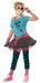 Teach your child about the '80's with this retro costume! Blue top with attached pettiskirt, printed leggings, one fishnet glove, scrunchy belt.