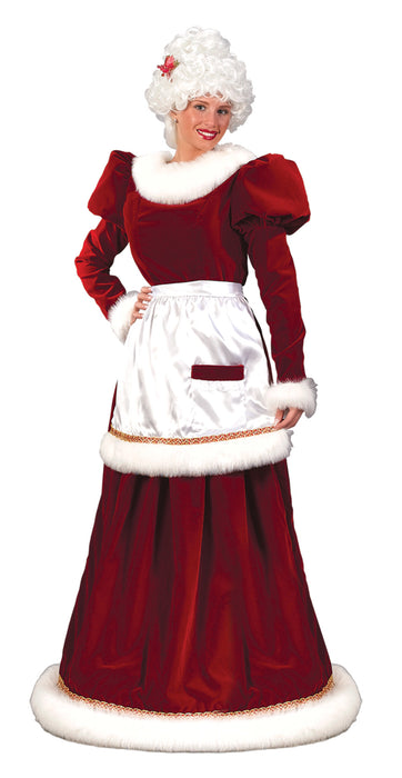 Long velvet dress trimmed in rich faux rabbit fur, satin apron with pocket brocade and faux rabbit fur trim. Adult size Medium-Large 6-10. Wig not included. Polyester, acrylic, rayon, nylon. 18" from shoulder to waist band 43" from waist band to fur bottom