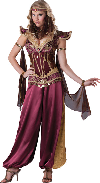 Perfect exotic look for your next costume party! Deluxe burgundy and gold brocade accented jumpsuit has lots of gold lace trims and golden coin accents and includes iridescent arm drapes with sequin armbands and a jeweled headpiece with gold trim and matching attached veil. Wow!