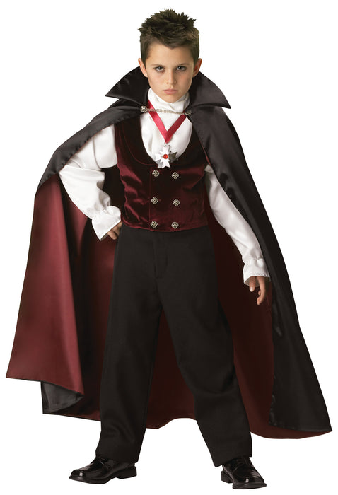 Velvet vest with attached shirt sleeves, dickie shirt front with scarf collar, full length lined satin cape, pants, and medallion on ribbon.