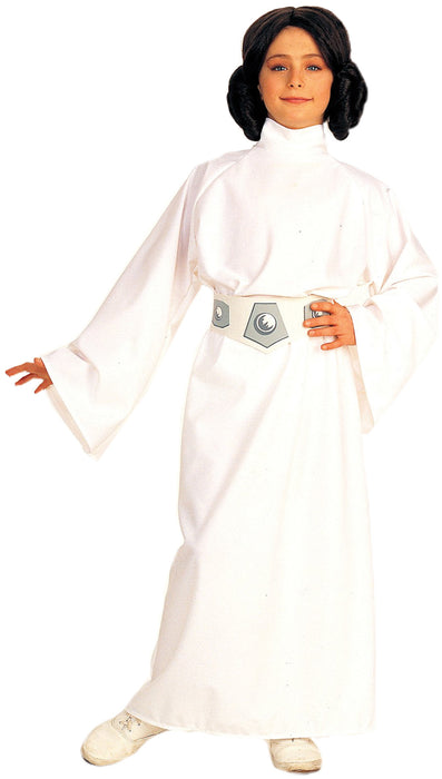 Become the brave galactic Princess Leia from the Star Wars movies with this great costume! Long white dress includes belt with printed details, and brown wig with side buns.