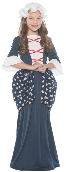 Perfect costume for school plays and patriotic events! Blue dress with white inset panel has red ribbon trim and side panniers with printed star fabric. A white mob cap is included!