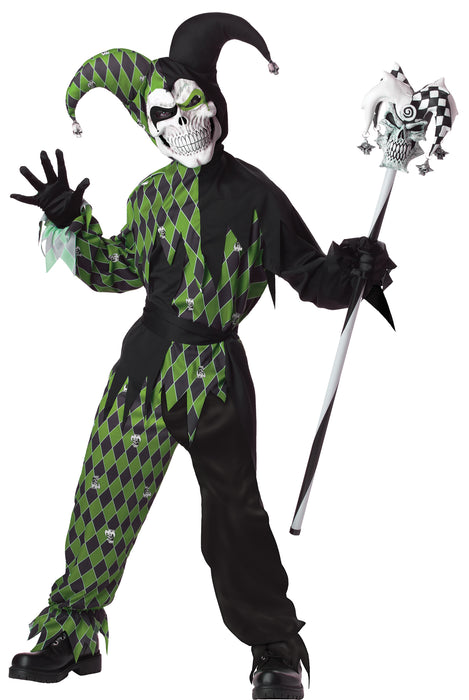 - Evil Jester Design: The Jokes On You! Costume features a black and green harlequin print tunic and pants, giving a classic yet eerie jester look.
