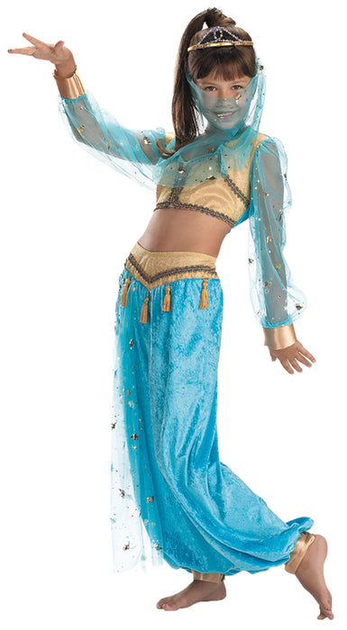 Your girl will get her wish in this elegant genie costume! Gold top with sheer turquoise sleeves and gold cuffs comes with flowy turquoise harem pants with gold tassels and trims. Includes a sheer turquoise veil and golden tiara!