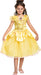 Transform your little one into the enchanting Belle from Beauty and the Beast with this Belle Classic Costume! This lovely yellow dress features a full knee-length skirt with a tulip-shaped peplum, a fitted bodice with a patterned inset, gold trims at the elastic waist, and a sheer shoulder drape. The character cameo and ribbon-trimmed hem add rich detail, making this costume perfect for any aspiring princess.