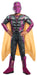 Your child can become his favorite hero The Vision from the Avengers Age of Ultron movie! Includes a deluxe padded jumpsuit with velcro closure at center back realistic printed details padding in chest and shoulders to give it a muscular look. Also comes with a molded plastic mask that has an elastic strap for a secure fit, attached 3-D foam boot tops that have elastic straps to secure around shoes, attached 3-D gauntlets, and a velcro-fastened cape. 100% polyester fabric, stuffing: 100% polyurethane foam. Care instructions: Hand wash in cold water, dry flat. Do not iron, bleach or dry clean.