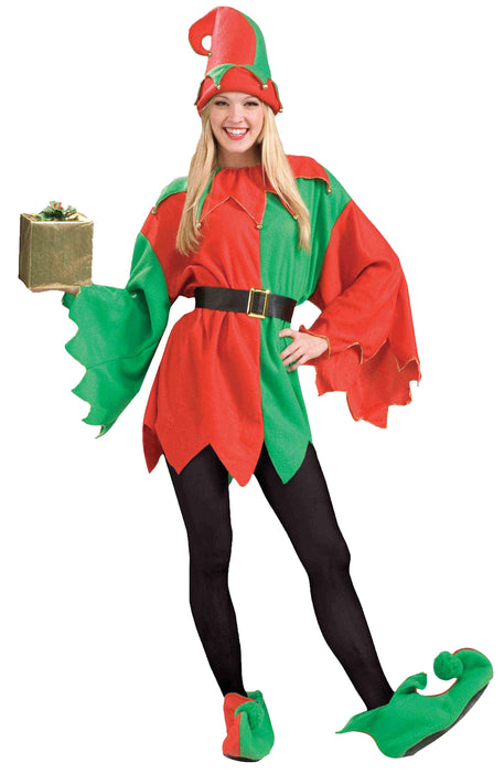 Included in this festive package are a belt to cinch the tunic for a customized fit, a matching jingle bell hat that adds a cap of cheer, and whimsical shoe covers adorned with pompoms, completing the elfin look from head to toe. Whether you're attending a holiday party, participating in a Christmas parade, or simply bringing smiles at a family gathering, this costume is your ticket to elfish enchantment.