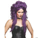 Want to be a witch or sorceress for Halloween? You’ll love this black and purple costume wig!Teased hair up high and curly with long straight sides hanging down. Your Sorceress costume will come to life.