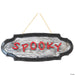 Welcome guests, visitors, and trick-or-treaters with the Spooky Animated Halloween Sign, a perfect addition to your festive decorations. This wood-toned sign features an old-style design that reads "Spooky" and glows with an eerie red light, creating a chilling and atmospheric touch for the Halloween season. Hung by a rope, this sign is easy to display and instantly sets the mood for any spooky setup.