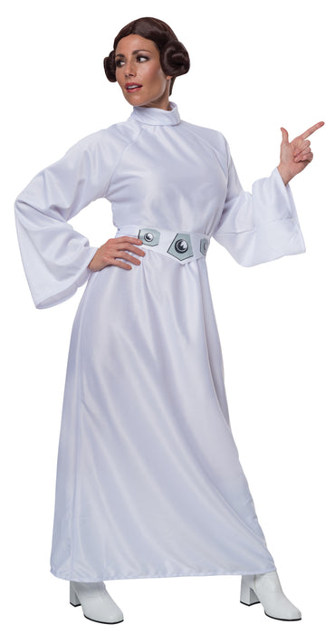 The force is sure to be with you when you're wearing this great Princess Leia costume. White dress, belt, and wig. Fits women's standard sizes 8-12. Shoes not included.