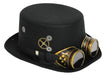 Felt top hat with steampunk goggles attached to the brim as well as metal look gear detailing on one side of the hat. One size fits most adults.