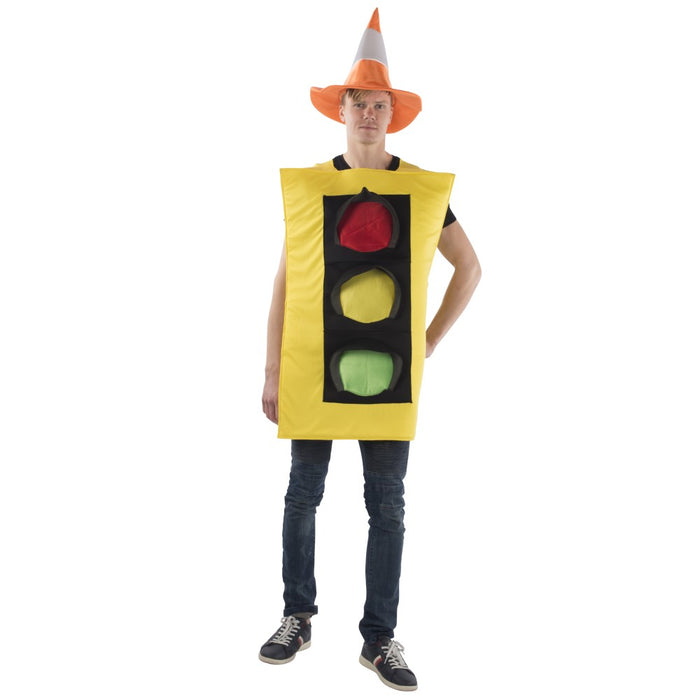 Add a playful and unique touch to any event with this multi-colored Traffic Light Tunic and Safety Cone Hat. Perfect for fancy dress parties, Halloween, costume events, or any other occasions, this costume is sure to make you stand out in the crowd.