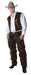 Perfect cowboy look. Faux leather chaps and vest withfringe. One size fits most. Measurements: antstop to bottom 42 inches, inseam of chaps 30 inches, waistsize (40 inches), vest (fits up to 44 inches). Set hasmatching buckle and fringe accents on pants and vest. Brown.Open chest with no closure. Lightweight set.