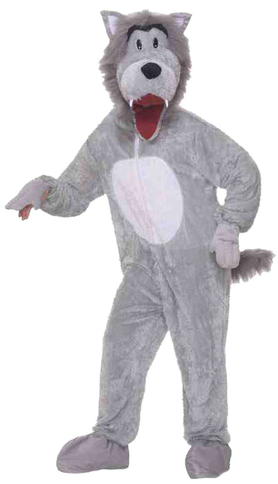 Plush wolf mascot includes head with vision from mouth opening, jumpsuit with attached mittens with hidden openings and foot covers. One size fits most.